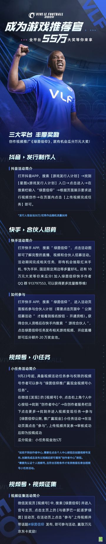 "text": "「主播招募计划」 现已开启!参与活动瓜分万元好礼!\n参与绿茵信仰冲榜即可瓜分万元京东卡,更有最佳经理奖、勤奋经理奖、绿茵瓜分奖……\n\n◆招募时间:9月21日10:00 – 10月20日24:00\n◆招募平台:\n虎牙直播:https://blog.huya.com/news/38001\n斗鱼直播:https://yuba.douyu.com/p/955809131663662840\nCC直播:https://cc.163.com/2022/09/20/lvyinxinyang/\n\n《绿茵信仰》全平台公测现已开启!魔兽德罗巴倾情代言,全新次世代拟真足球竞技游戏,期待你的到来!",