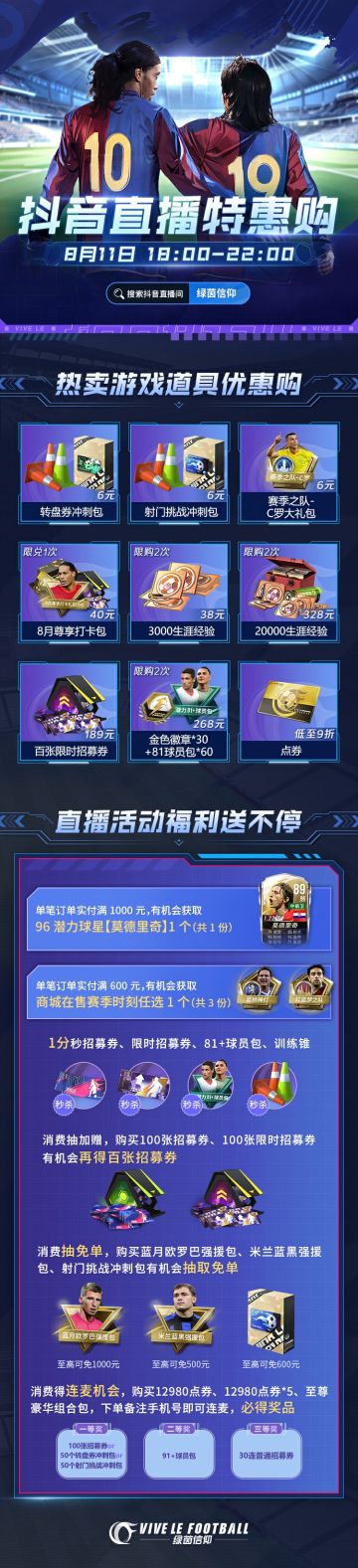 ⭐96潜力全新传奇登场,8月11日抖🎵直播等你来抽⭐ 阿...阿嚏!Olivia就说今天怎么有一丝丝凉意,原来已经是立秋后的第一天啦~秋天除了要喝第一杯奶茶,小助理还带来了秋天的第一场直播福利!经理们快来看看都有什么惊喜吧~记得设置好手机提醒,8月11日18:00抖🎵直播间不见不散! ⭐热卖游戏道具优惠购:转盘券冲刺包、射门挑战冲刺包、8月尊享打卡包等惊喜福利来袭! ⭐直播活动福利送不停:96潜力