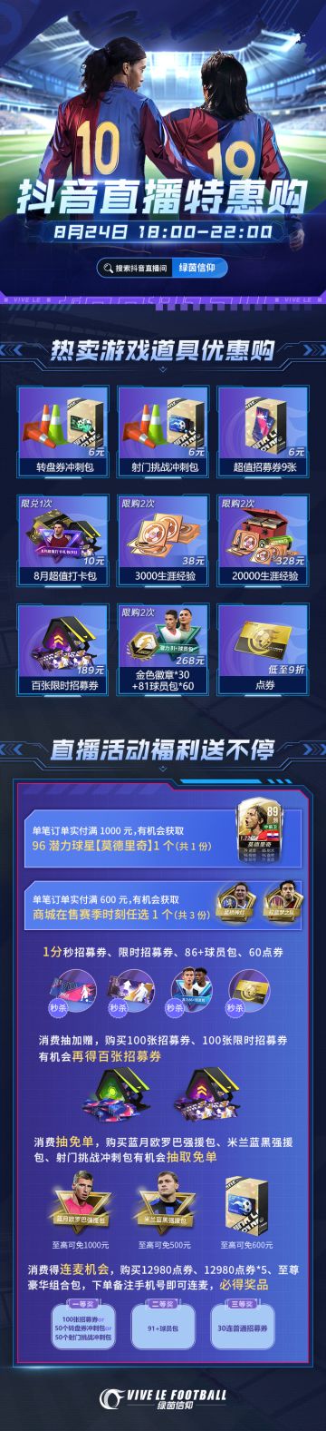 ⭐0.01秒60点券,8月24日18:00抖🎵直播⭐ 是谁七夕还在上班?原来是Olivia.....看到朋友圈满屏的惊喜礼物,说不羡慕那是假的!别急别急,别人有的,我们都有!绿茵已经在给经理们安排惊喜福利啦~ 0.01秒60点券?超值礼包?消费抽免单?这些都少不了!快和小助理一起锁定8月24日18:00抖🎵直播间吧~ ⭐热卖游戏道具优惠购:转盘券冲刺包、射门挑战冲刺包、6元9张招募券等超值福利来袭