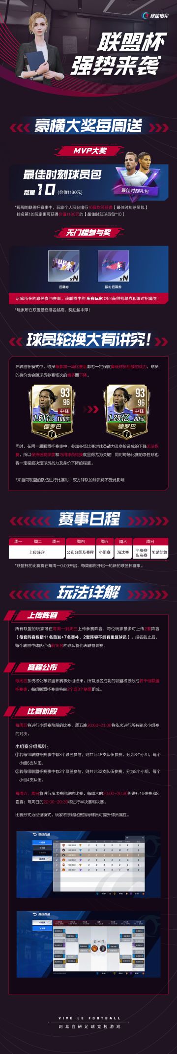 { "text": "☆全新玩法「联盟杯」即将上线☆\n\n11月7日,全新的「联盟杯」玩法重磅登场!与同联盟好友并肩作战,角逐最强联盟,你准备好了吗?\n※点击下方图片,查看详细玩法前瞻↓↓↓\n\n世界杯即将来临!看完Olivia递上的「联盟杯」介绍,经理们是不是要问世界杯其他的活动与玩法了呢?根据秃头策划近日的掉发情况来看,相信马上就有了~ \n\n《绿茵信仰》全平台公测现已开启!魔兽德罗巴倾情代言,全新次世代拟真足球竞技游戏,期待你的到来", "raw_text": "" }