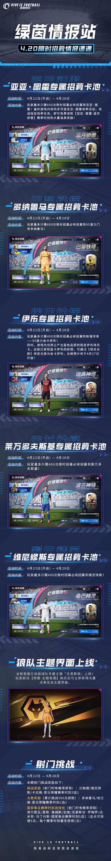 「绿茵情报站-限时招募卡池」0420情报速递! 听说大伊布升金了!诶诶诶,经理们是早就知道了嘛?Olivia最喜欢这类"阳光帅气大男孩"了(bushi~ 这不,赶紧整理近期限时招募卡池情报,经理们快来跟Olivia一起看看有哪些球员吧~ ☆94潜力金卡中锋【波兰神锋-莱万多夫斯基】 ☆95潜力金卡中锋【瑞典神塔-伊布】 ☆95潜力金卡门将【巴黎铁塔-多纳鲁马】 ☆95潜力金卡后腰【蓝月骄傲-亚亚·