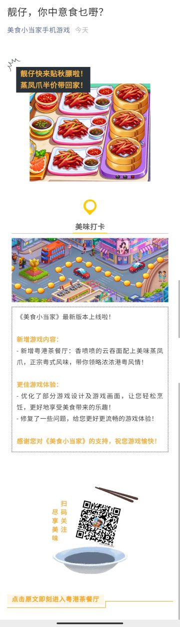 { "text": "《美食小当家》最新版本上线啦!\n\n新增游戏内容:\n- 新增粤港茶餐厅:香喷喷的云吞面配上美味蒸凤爪,正宗粤式风味,带你领略浓浓港粤风情!\n\n更佳游戏体验:\n- 优化了部分游戏设计及游戏画面,让您轻松烹饪,更好地享受美食带来的乐趣!\n- 修复了一些问题,给您更好更流畅的游戏体验!\n\n感谢您对《美食小当家》的支持,祝您游戏愉快!\n", "raw_text": "" }