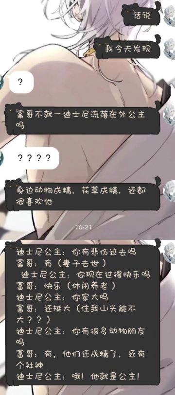 { "text": "最近被朋友带回坑了,今天和朋友聊天,突发奇想了属于是\n\n被科普写信给我的不是富哥而是老农了(大误会了属于是),改改改改\n\n迪士尼公主:你有美好爱情吗\n老农:我妻子和我是青梅竹马\n迪士尼公主:你有悲伤过去吗\n老农:有(妻子去世)\n迪士尼公主:你现在过得快乐吗\n老农:快乐(休闲养老)\n迪士尼公主:你家大吗\n老农:还挺大(住我山头能不大??)\n迪士尼公主:你有很多动物朋友吗\n老农:有。他们还成精了,还有个社神\n迪士尼公主:哦!他就是公主!", "raw_text": "" }