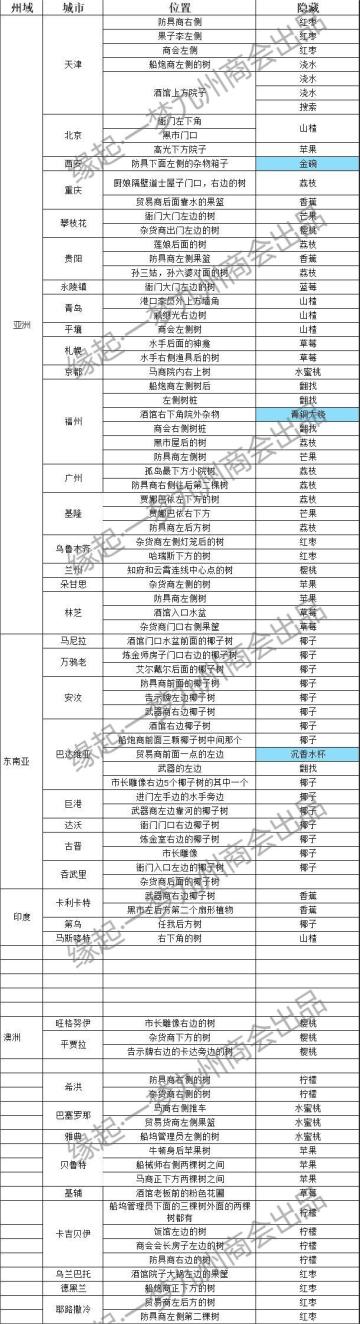 各城市水果和属性水果出产归纳,助你完成吃水果成就。