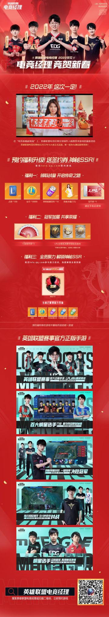 { "text": "各位经理人,感谢各位一直的关注与理解,大家的催更一直在鞭策着我们努力工作,今天终于可以与大家分享这个好消息了!\n\n英雄联盟电竞经理已进入最后的研发冲刺阶段,我们将在不久后启动一轮对外测试,并会在2022年与大家正式见面!\n\n在过去,LPL迎来了诸多光辉时刻,我们也对预约福利进行了升级。现在前往官网预约游戏,即可获得:\n一、战备礼包:点券*188、金币*18888、高级能量饮料*10、助理余霜(7天)、签约券*1(需绑定手机获取);\n二、冠军荣耀:10连签约券 x 3 ,IG、FPX、EDG夺冠纪念道具*1;\n三、全员助力:神秘SSR选手卡*1(需达到1200万势力值)、点券* 216、大量金币与能量饮料。\n\n接下来我们将会及时与大家分享测试的计划和更多游戏消息,敬请留意,祝各位经理人春节快乐!\n\n英雄联盟电竞经理,2022年,这次一定!", "raw_text": "" }