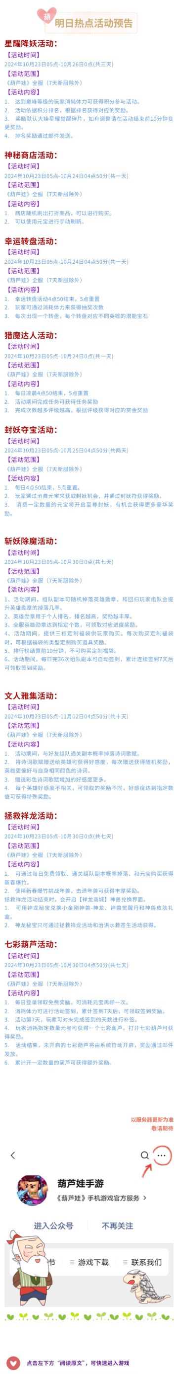 【葫芦娃】10月23日活动预告