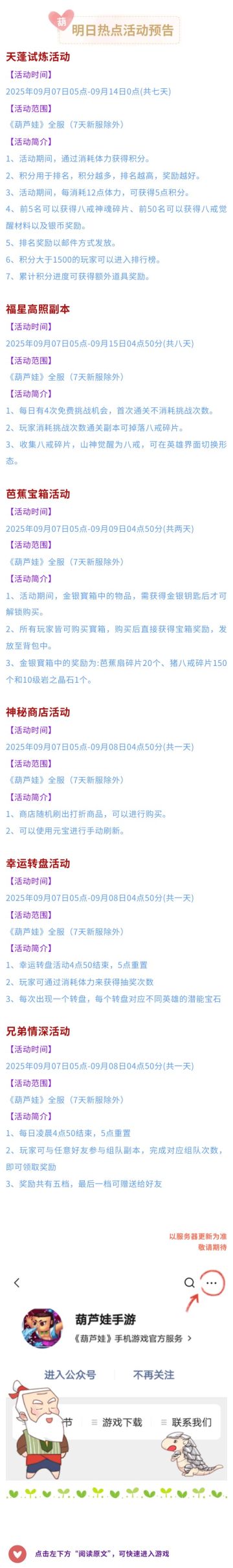 【葫芦娃】9月7日活动预告