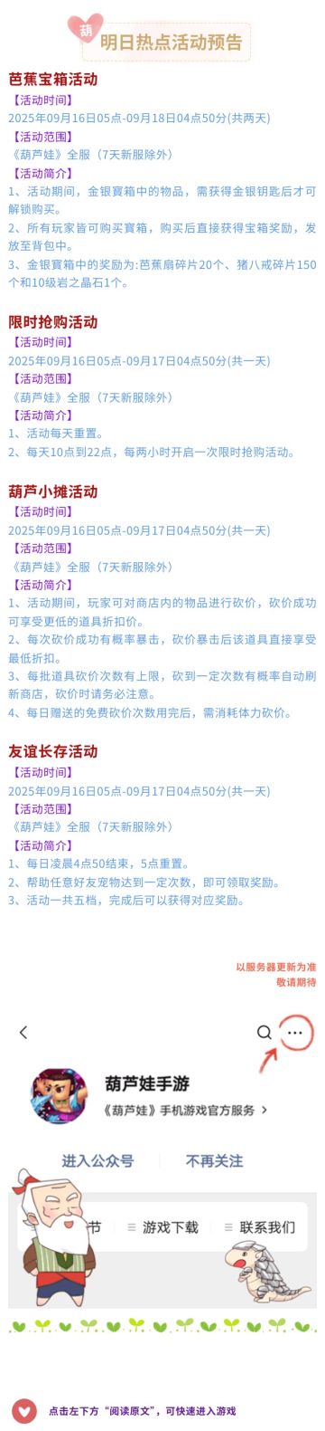 【葫芦娃】9月16日活动预告