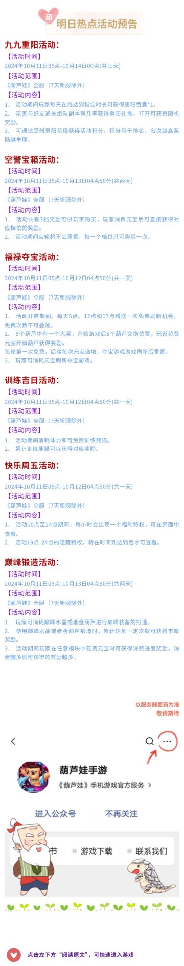 【葫芦娃】10月11日活动预告