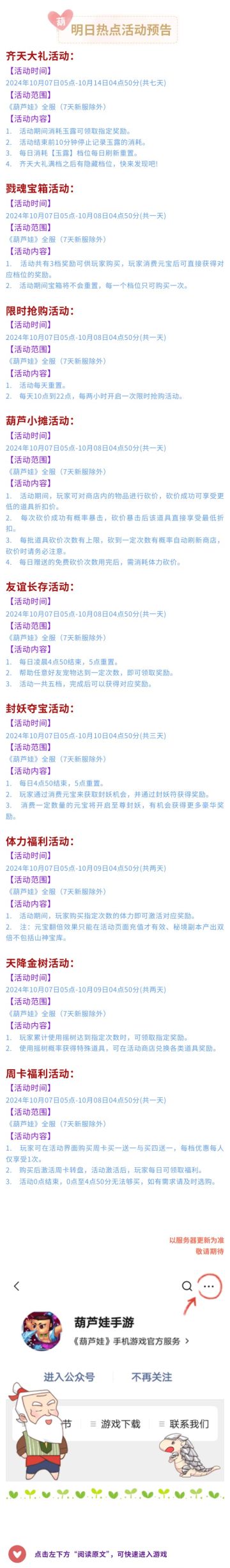 【葫芦娃】10月7日活动预告