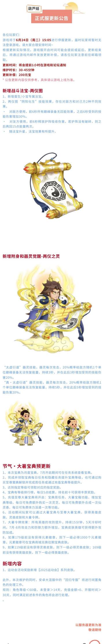 葫芦娃手游 6月24日版本更新公告