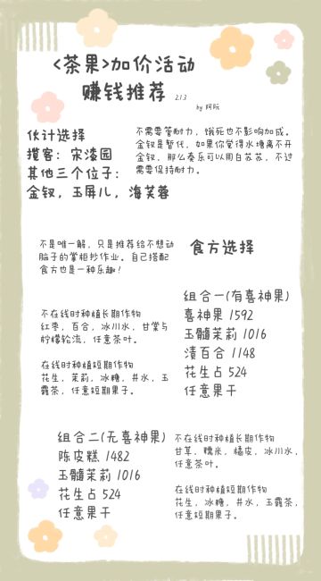 【攻略】活动赚钱推荐(更新茶果,配菜,其他,酒)