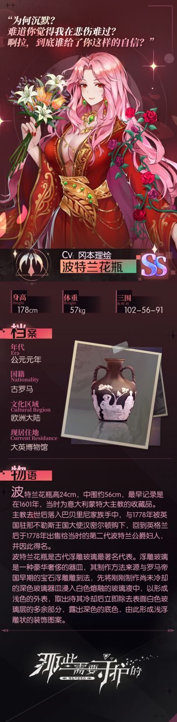{ "text": "【具现灵博物馆】波特兰花瓶\n波特兰花瓶,过往的坎坷经历让她看起来并不那么平易近人,甚至有些高傲,但不得不承认,她确实美丽又强大。\n\n“看呐,这玫瑰开的这般灿烂,令人忍不住驻足,这世上有几人能如鲜花一般。”", "raw_text": "" }