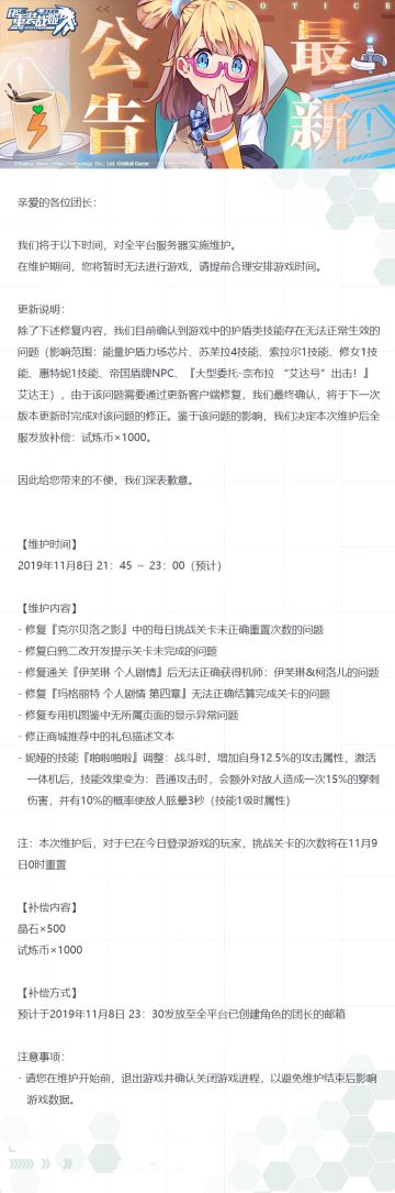 【重装战姬】版本更新维护公告(2019年11月7日)
