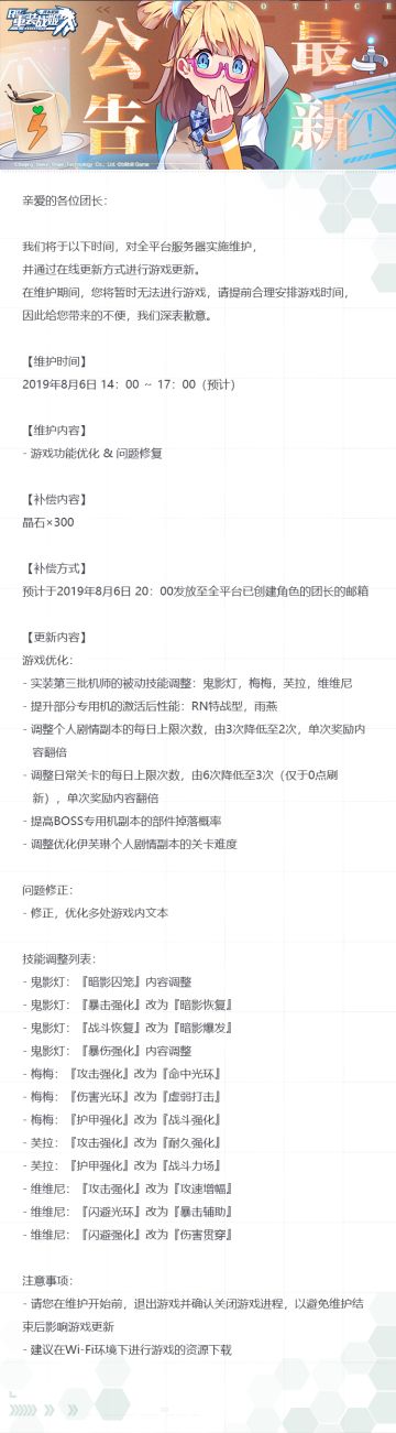 【重装战姬】更新维护公告(2019年8月6日)