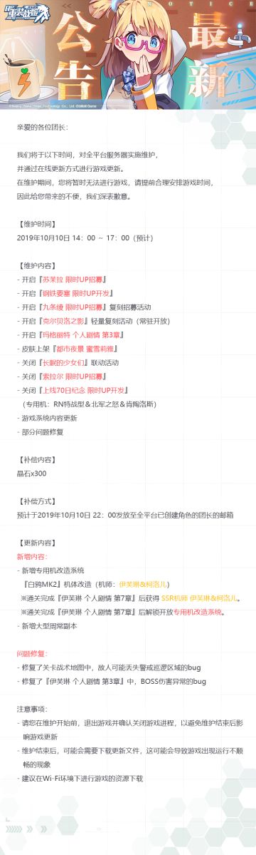 【重装战姬】更新维护公告(2019年10月10日)