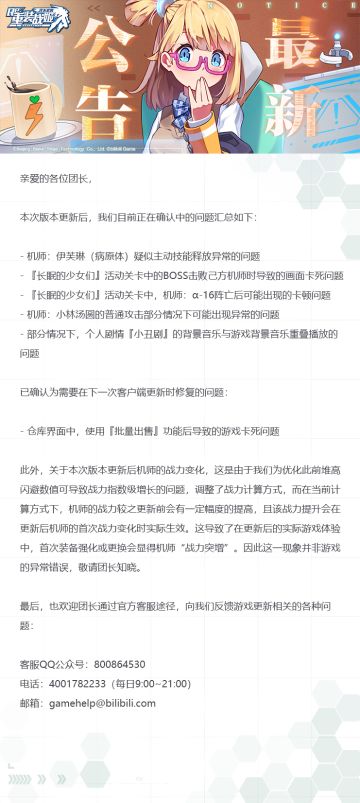 【重装战姬】关于版本更新后游戏内问题的公告