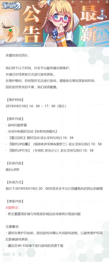 【重装战姬】更新维护公告(2019年9月19日)