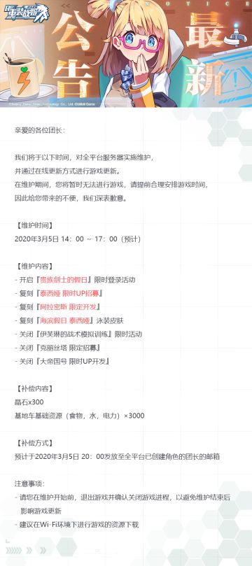 【重装战姬】更新维护公告(2020年3月5日 18:00追加)
