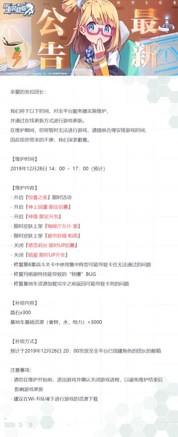 【重装战姬】更新维护公告(2019年12月26日)