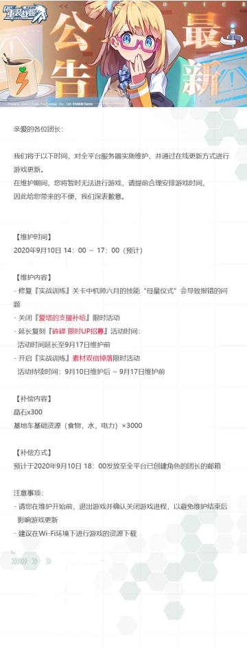 【重装战姬】更新维护公告(2020年9月10日)