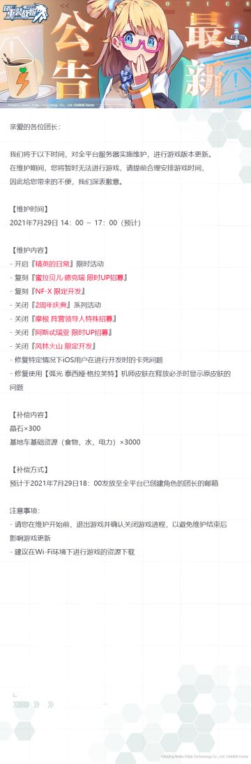 【重装战姬】更新维护公告(2021年7月29日)