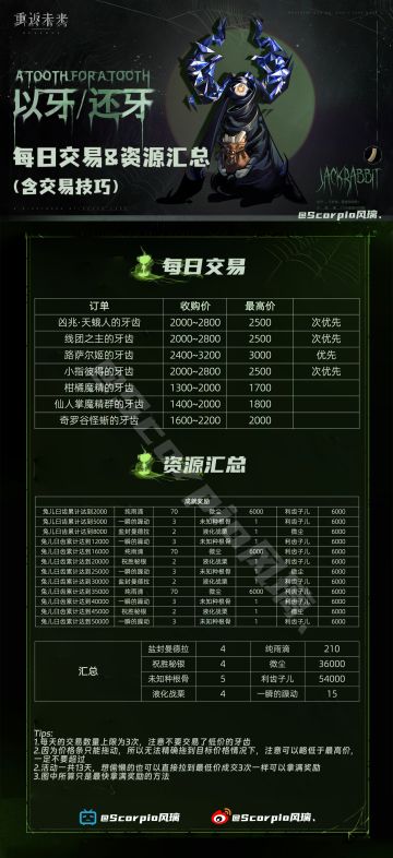 「以牙还牙 报价技巧&资源汇总」一图流 计算了一下每天拿最低的吃保底也可以拿完奖励 想快速养老摆烂的可以根据图找优先的3个交易 还有其他不懂的欢迎评论区指出#重返未来1.2绿湖噩梦征集活动#重返未来:1999#攻略#游戏安利#重返未来1999攻略#重返未来:1999公测图文征集