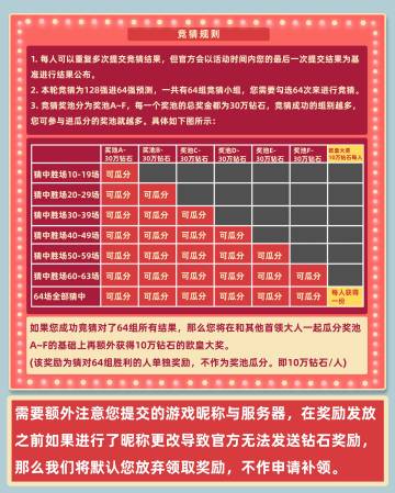 "text": "【赛事前线 | 争霸赛竞猜活动上线!还有百万钻石奖池等你来瓜分哦~】\n\n精英争霸赛赛事中心激情上线!\n本周第3轮淘汰赛结果竞猜活动也同步上线啦😝\n\nhttp://www.brutalagetournament.com\n↑通过上方链接进入赛事中心竞猜活动栏哦~😍\n\n【活动时间】\n2021年12月10日 18:00~2021年12月12日 08:00\n(北京时间)\n\n【活动规则&活动奖励】\n具体规则及奖励请参照示例图!\n\n小妹友情提示,参与竞猜之前请一定要仔细查收活动截止时间和竞猜规则哦~🙈",
