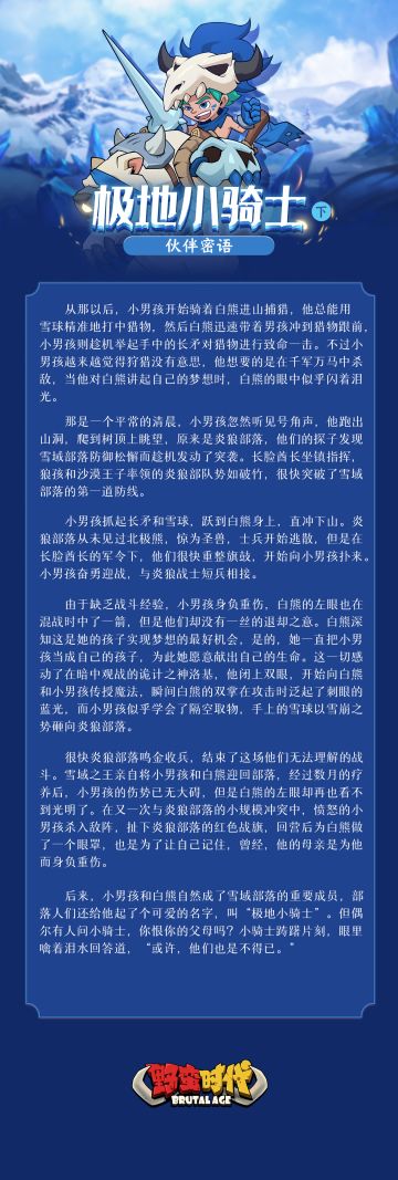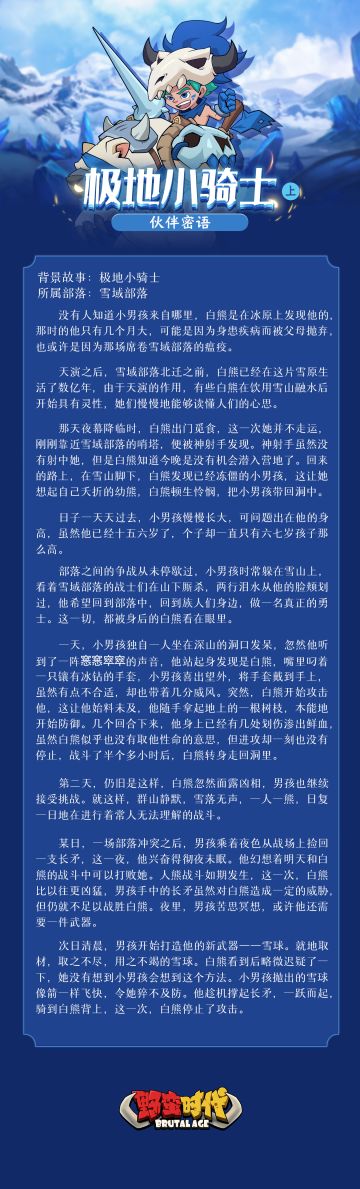 "text": "【伙伴密语 | 极地小骑士(下)】\n\n雪球成为了男孩的武器,他感觉离自己的梦想愈发近了。\n他的机会来了,雪域部落和炎狼部落爆发了冲突;他如愿以求地站在了战场上。\n\n可是天不遂人愿,他对这个世界掌控得太少——他太弱了,敌人太强了。\n还好他有白熊,白熊再一次拯救了他的生命。",