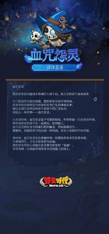 "text": "【新伙伴预热 | “血咒怨灵”伙伴密语上线!】\n\n白天时,他是和其他小孩一起扎堆疯玩的小孩子。\n夜晚时,他却变身为骑着扫把的幽灵,到处散播诅咒...\n\n他是其他部落甚为苦恼的“麻烦”,但却是黑暗部落推崇备至的“英雄”。",