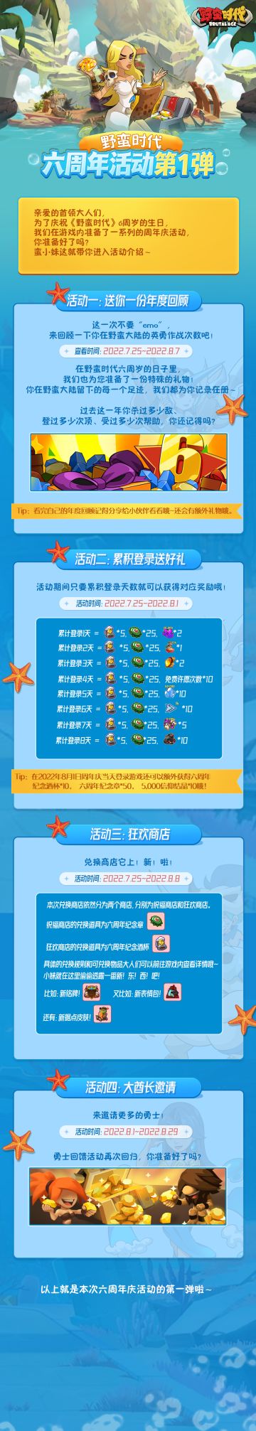 "text": "【活动宣传|六周年庆游戏内活动第1弹】\n\n悠悠夏日易有好事~《野蛮时代》马上六岁啦!\n(掌声在哪里,尖叫在哪里!😆)\n游戏内即将迎来六周年庆活动狂欢季,小妹老早就听到大人在催促啦!\n准备好了吗?\n我们这就进入活动介绍!~",