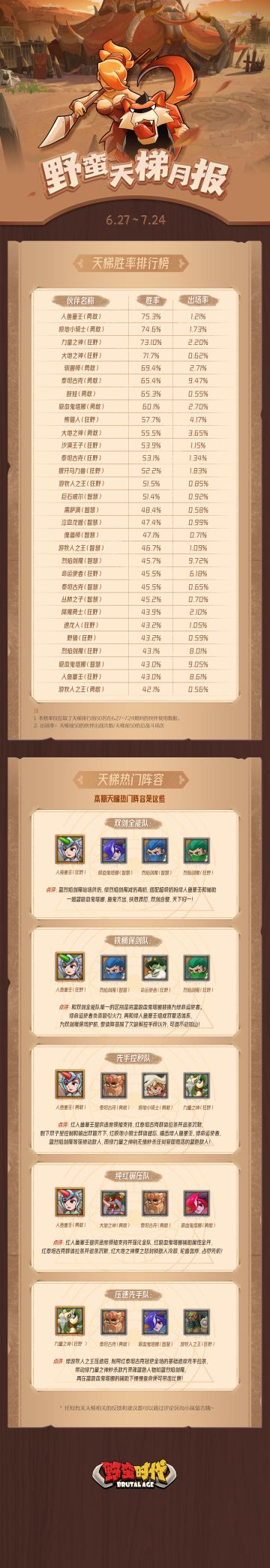 "text": "【烽火秘闻丨“野蛮天梯月报”正式上线!】\n\n亲爱的首领大人安!\n小妹今天为大人们带来了好东西!(不是)\n\n有没有大人一直苦恼于伙伴搭配呀?\n举个手让小妹看看~(小妹自己举个手先!🙋)\n\n小妹和运营大大商量再三,最终拜托做出了这份“天梯月报”!\n之后月报会以每月的频率进行更新,\n不出意外的话将会有天梯胜率排行月榜、热门阵容排行榜~\n(排行榜一般只会截止到前面部分名次哦,还请谅解😭)\n当然啦,如果大人们有想看的内容我们没有准备到的欢迎提意见哦!🙋\n\n现在让我们看看首期“野蛮天梯月报”吧~",