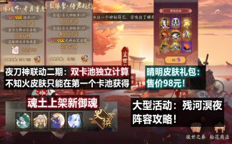 【阴阳师】大型活动 残河溟夜:阵容攻略。晴明皮肤礼包98元,双卡池独立计算!魂土上架海月火玉等新御魂