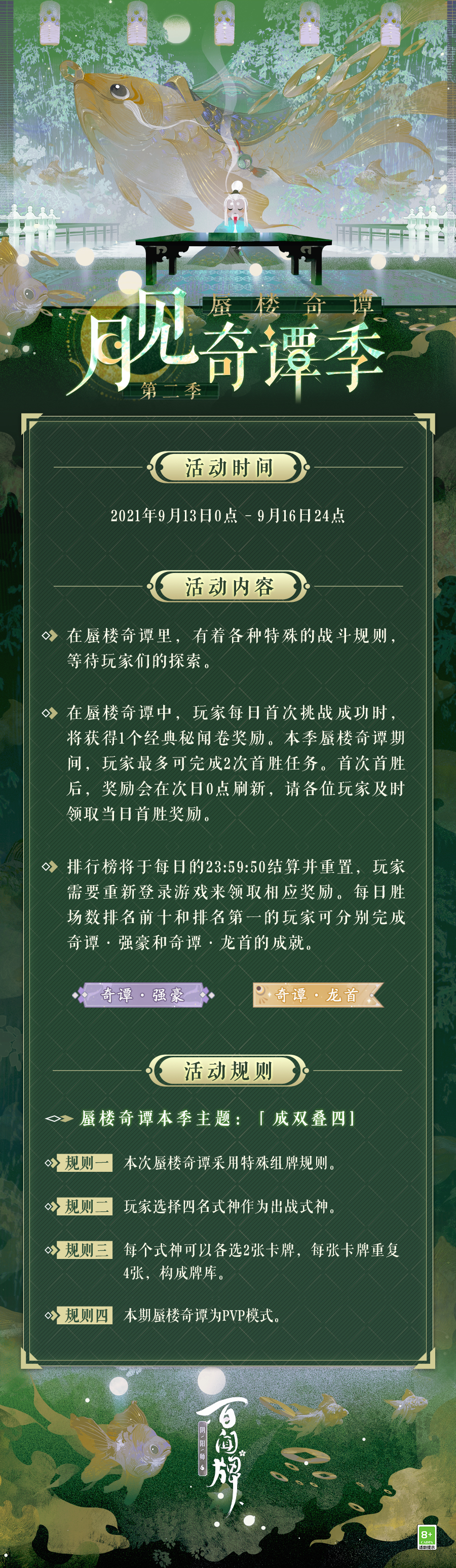 { "text": "「月见奇谭季」第二季即将开启!本季主题为「成双叠四」,客人们可以为队伍中的每位式神选定两张卡牌,并各复制4张后置入牌库进行卡组构筑。\n如此特别的组牌规则下,或许对局也会增添不少趣味与戏剧效果,不知道客人们首选复制的卡牌会是哪些呢?\n\n更多详情请戳长图了解~↓↓↓", "raw_text": "" }