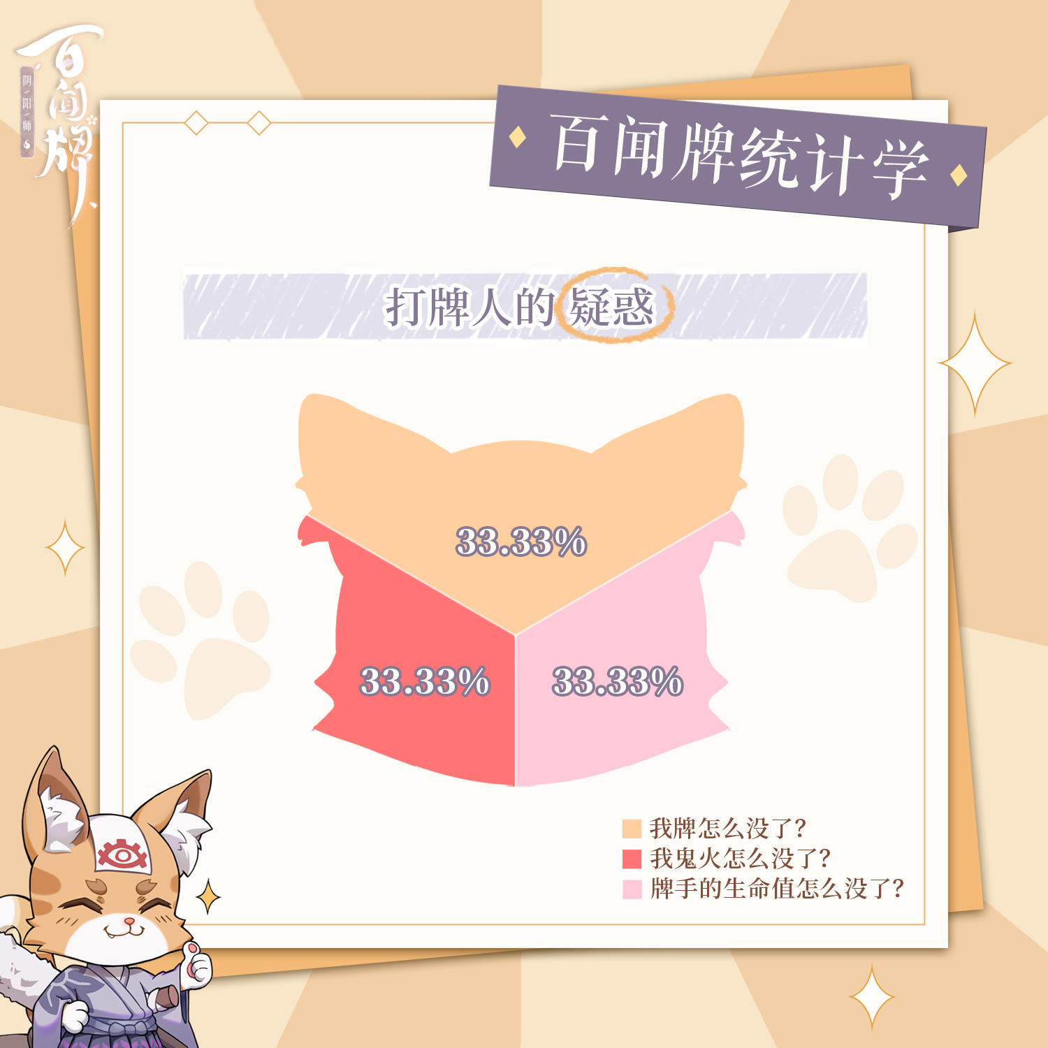 { "text": "三目最近在上「百闻牌统计学」课程,想让大家看看我的课后作业↓↓↓\n虽然很多都是不完全统计得出的结果,但关于“大家对三目的印象”的统计可是有理有据\n\n最后还想请大家分享一下自己“打牌最快乐的瞬间”,一起完成这份调研~", "raw_text": "" }