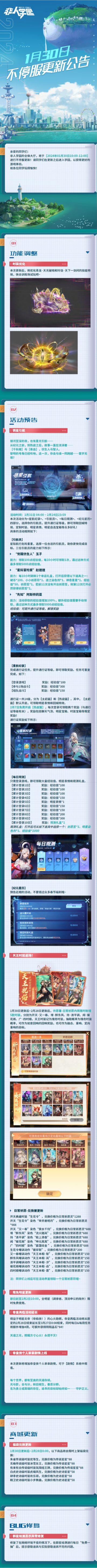 #非人学园##S23:纪元之前# 【1月30日不停服更新公告】重点如下~ ⭐活动预告:1月31日04:00-2月24日23:59,锈星引航系列活动上线!提升通行证等级即可领取定制时装、回城特效等好礼!1月30日更新后,天王时装限时返场,许愿署-日常祈愿内将限时新增5款时装,日常祈愿-兑换屋更新;即日起-2月2日10:00,全明星限免更新(除调律者、顶流申公豹外);帝皇再临活动延长、个人单章剧情上线