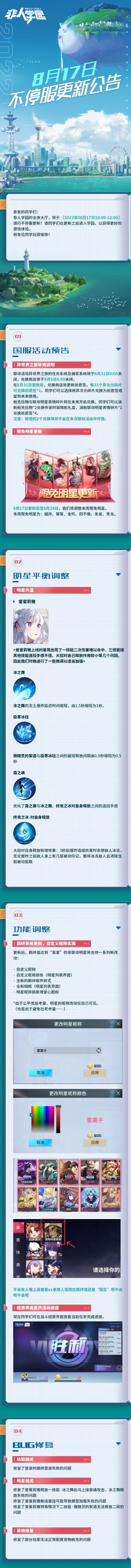 "text": "#非人学园#\n【8月17日不停服更新公告】重点如下~\n⭐国服活动预告:联动活动【异世界之旅】任务系统及抽奖系统将于8月31日关闭,兑换商店将于9月5日关闭;帕克信物与联动明星表情碎片将在未来开启兑换。\n⭐明星平衡调整:明星爱蜜莉雅升温。\n⭐功能调整:羁绊系统更新,自定义昵称功能实装,战斗结算页面显示任务完成进度。\n⭐限免明星更新:姻月、饕餮、金吒、四不像、朱雀、青龙。\n更多信息请点击长图查看详情。\n—————— ฅ՞• •՞ฅ ———————\n哟呼!非人学园官方QQ群现已建立!\n想找好伙伴一起开黑吗?\n马上加入QQ群,同学们一呼百应~\n官方群:1063879524\n快快下载《非人学园》一起游戏吧(╭ ̄3 ̄)╭\n下载地址:http://qwq.163.com/fab/",