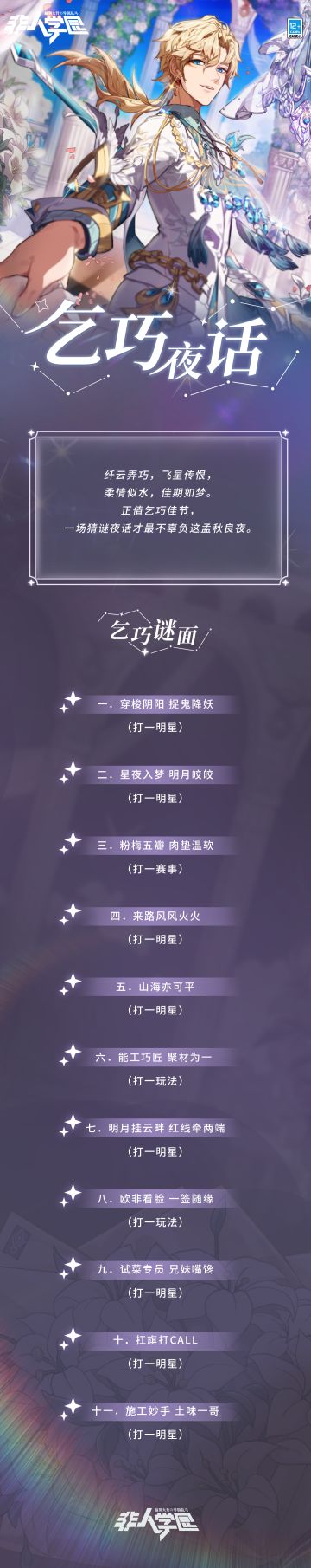 "text": "#非人学园#\n夜幕轻垂,七夕悄至,\n每逢此日,女儿们细心梳妆打扮,\n点绛唇,做巧果,于鹊桥边聚首。\n或行令猜谜,或引针乞巧,\n指点天上星象,话牛郎织女轶事。\n\n如此孟秋良夜,大家相聚非人学园,\n雷雷为同学们准备了一场猜谜夜话,\n十一个谜底都与学园相关,\n快来评论区说出你的答案吧~\n—————— ฅ՞• •՞ฅ ———————\n哟呼!非人学园官方QQ群现已建立!\n想找好伙伴一起开黑吗?\n马上加入QQ群,同学们一呼百应~\n官方群:1063879524\n快快下载《非人学园》一起游戏吧(╭ ̄3 ̄)╭\n下载地址:http://qwq.163.com/fab/",