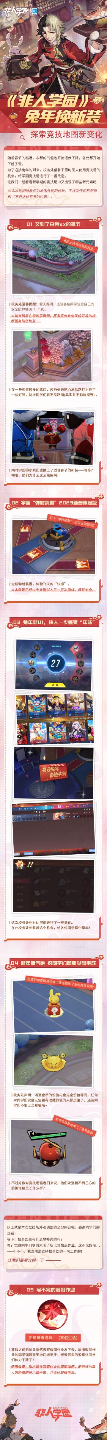 #非人学园##S23:纪元之前# 【1月3日不停服更新公告】重点如下~ ⭐活动预告:1月1日00:00-1月10日23:59,2024新年幸运签活动开启!活动期间首次登陆即可摇签,看看今年的幸运明星是谁吧!活动期间参与战斗获得【2024开年礼盒】,累计开启6个必定获得祈愿签! ⭐BUG修复:修复了开启严选多模展示后皮肤模型加载异常的问题;修复该模式下部分明星时装特效、特殊场景未显示的问题;修复了