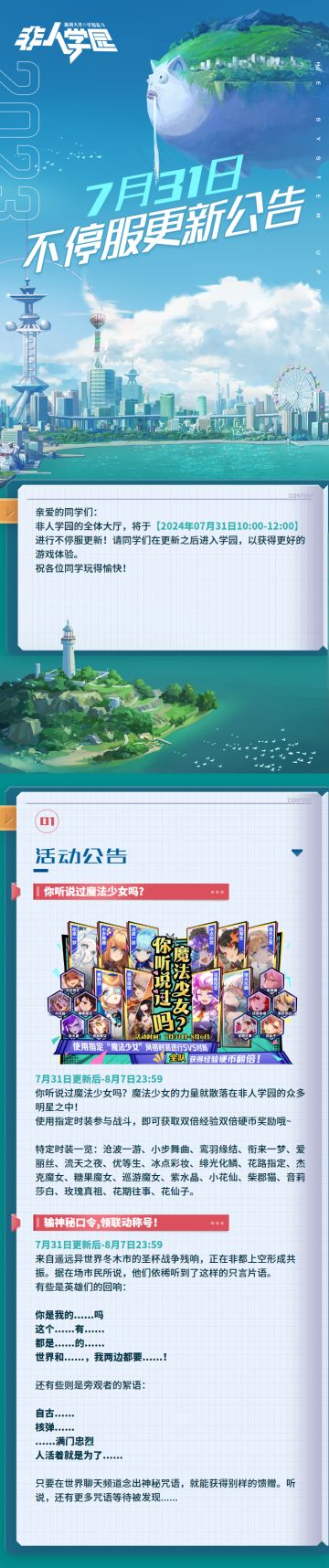 【7月31日不停服更新公告】重点如下~ ⭐活动公告: ⭐你听说过魔法少女吗:7月31日更新后~8月7日23:59,使用特定时装参与战斗,即可获得双倍经验双倍硬币奖励! ⭐输神秘口令,领联动称号:7月31日更新后,玩家在世界聊天频道输入指定的口令,即可触发特殊效果并获取联动奖励称号。 —————— ฅ՞••՞ฅ——————— 哟呼!想找好伙伴一起开黑吗? 马上加入Q群,同学们一呼百应~ 非人学园③群