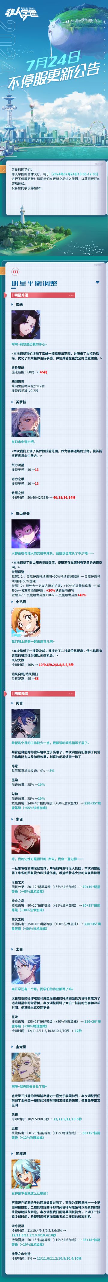 #非人学园 #S25:昆仑之下 【7月24日不停服更新公告】重点如下~ ⭐明星平衡调整: 明星玄蛛、芙罗拉、影山茂夫、小钻风升温。 明星判官、朱雀、太白、金光圣、阿库娅降温。 —————— ฅ՞••՞ฅ——————— 哟呼!想找好伙伴一起开黑吗? 马上加入Q群,同学们一呼百应~ 非人学园③群:1064966282 快快下载《非人学园》一起游戏吧(╭ ̄3 ̄)╭