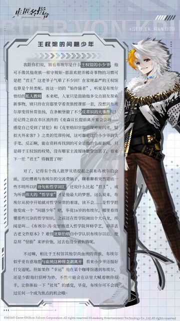 { "text": "代行者们,今天罗贝塔介绍的这位可算是条顿堡的重量级人物!当然我指的是存在感啦。他的个人身份、为人处世的方法以及鲜明的个性,可以说是无人不知无人不晓,就连各大媒体和广告牌上面也经常出现他的名字——布埃尔。\n\n就算是这么抢手的档案,我肯定也是不费吹灰之力地拿到手啦,让我来看看……\n", "raw_text": "" }