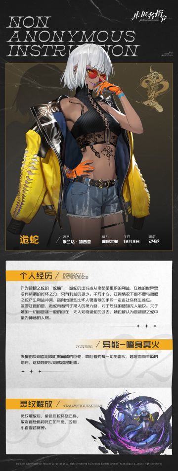"text": "#非匿名指令#\n最近呀事务所可算想起了罗贝塔我这个线人,一大早就发来了紧急委托。\n\n诶?这次的目标并不简单!监测的可是碧眼之蛇的谋士——诡蛇。在过去的信息中,诡蛇可谓是碧眼之蛇最为神秘的人物,即使在组织内部也很少有人知道她的过去,但那些狠辣的手段可是震慑了不少势力呢!档案已经到手了,代行者们一起来看看吧~\n",