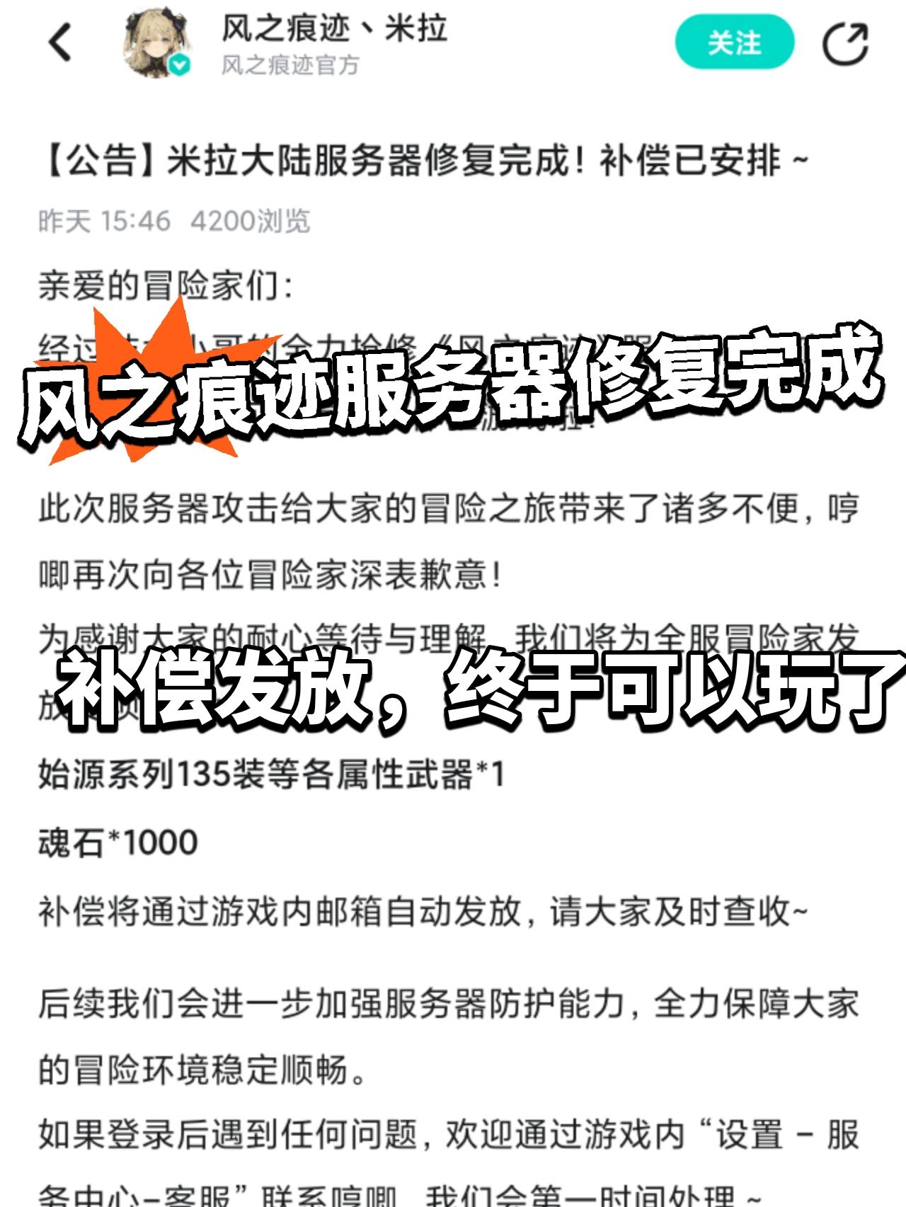 风之痕迹发放补偿,服务器修复完毕!