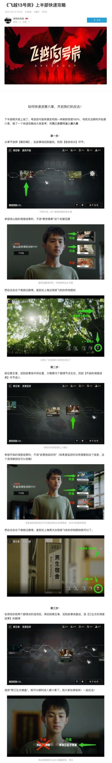 { "text": "第0到5章快速攻略,便于快速进入dlc反击篇哦~\n以前只会在tap上看游戏评论,这次这个游戏我真的太喜欢了啊!刷了全部结局之后就没管它了,结果因为明天上线想说看看宣传片,结果在b站刷到这篇文章。\n原来还会有卡关的说……我直接跟着一步步走过来了,好期待明天能打下半部。\n已经询问原作者大大“受伤的泡泡”同意转载了,所以给攻略码住分享给大家~\n期待明天的反击呀!!!冲冲冲!", "raw_text": "" }