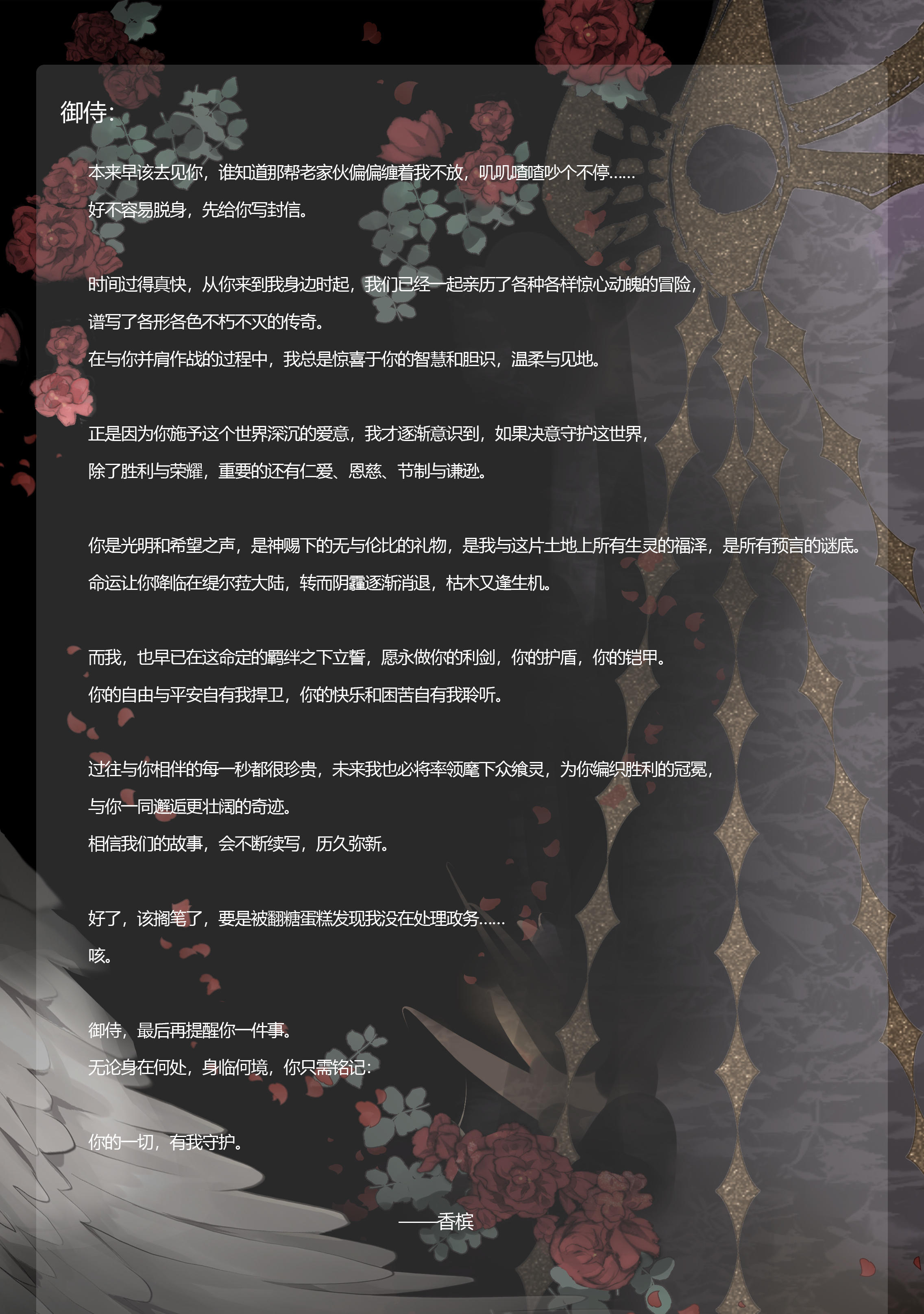 { "text": "在这命定的羁绊之下立誓,愿永做你的利剑,你的护盾,你的铠甲...\n相信我们的故事,会不断续写,历久弥新。", "raw_text": "" }