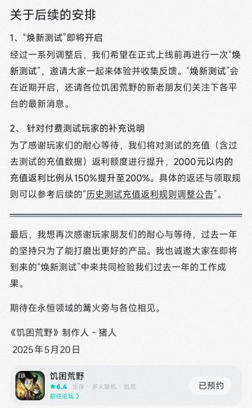 冒险家们好,本次「饱荒测试」服务器即将达到上限,服务器注册达到上限之后会自动关闭新用户注册入口。 我们很遗憾地通知您,服务器注册达到上限之后,测试资格码也将无法激活测试资格,请未激活测试资格码的冒险家尽快激活。 另外,本次「饱荒测试」已拥有测试资格的玩家可以继续体验《饥荒:新家园》的游戏内容,并在下次测试中有机会优先获得测试资格。#饥荒新家园#游戏讨论#游戏资讯