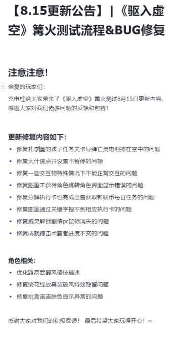 【8.15更新公告】|《驱入虚空》篝火测试流程&BUG修复