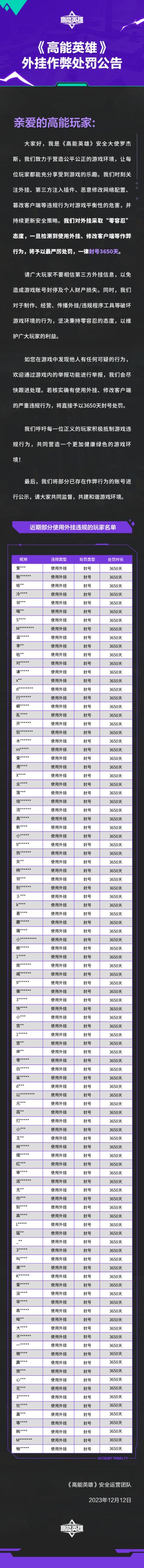 《高能英雄》外挂作弊处罚公告(12月12日)