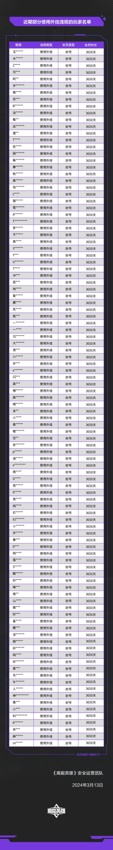 《高能英雄》外挂作弊处罚公告(3月13日)